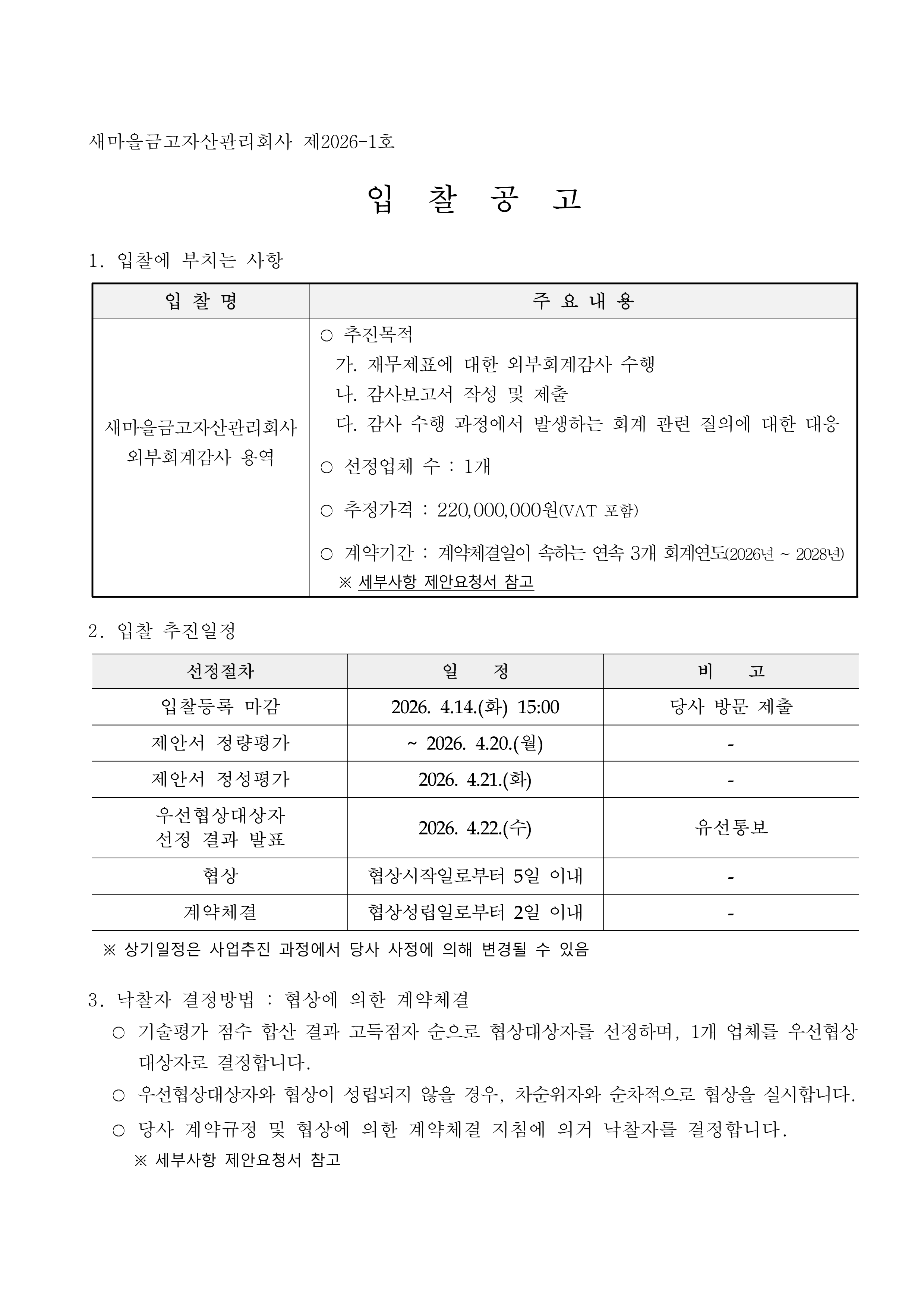 새마을금고자산관리회사 외부회계감사 용역 입찰공고